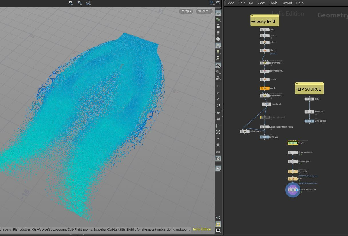 Using vel fields to control the flow of FLIP sims is quite the handy trick, and using the new source volume nodes set to “pull” allows you to add in your vel fields without them looking like they are taking over the sim completely. Here’s a hip file too: directable_FLIP.hiplc