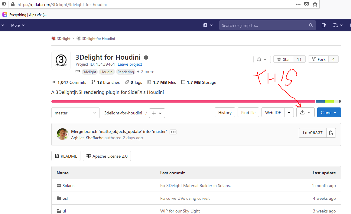 We need to grab the 3delight for houdini plugin files from gitlab. Go here: https://gitlab.com/3Delight/3delight-for-houdini and download the archive.