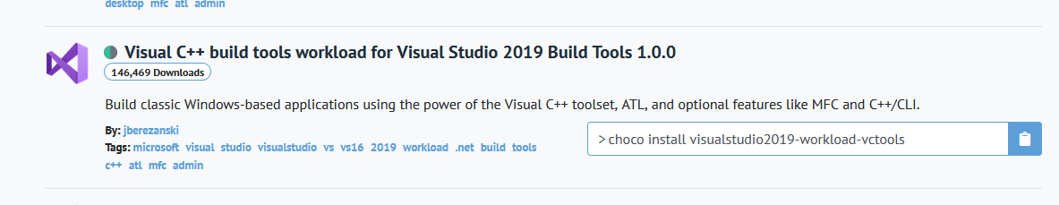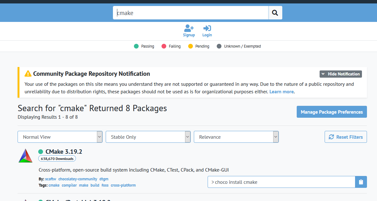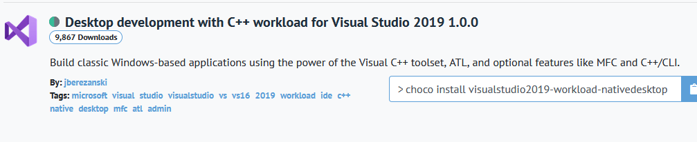 Hmm, actually I probably could have typed it, is was so simple. Eh, too bad. So choco is a great package manager for installing almost anything as I mentioned above. VLC, Blender, etc. Now let’s install CMake and Visual Studio & C++ tools through Chocolatey. We just need to do a quick search on the Chocolatey homepage to get the specific names of the packages.
