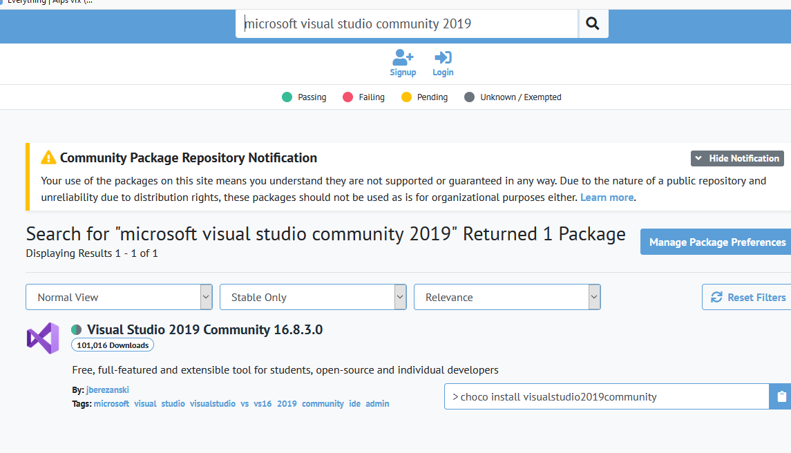 Microsoft Visual Studio Community edition & C++ build tools, also CMake. Now in the past I would grab all of these from their respective sites, but I thought I’d use Chocolatey as it really is a great manager and deployment tool for Windows based companies.